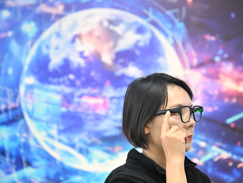 12月4日,在“AI·镜界—南京人工智能生态街区”,工作人员展示一款AI眼镜。\n 新华社记者 季春鹏 摄